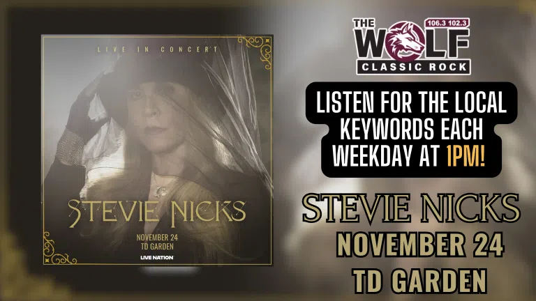 The Wolf has your LAST CHANCE to win tickets to Stevie Nicks at TD Garden on November 24th! Listen to Heather Gersten from Mon, 11/17 thru Fri, 11/21 in the 1pm hour for the local text keyword to TEXT IN to 401-272-5483 for your chance to WIN tickets!