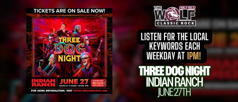 The Wolf has your chance to win a pair of tickets to Three Dog Night at Indian Ranch on June 27th! Listen to Heather Gersten from Mon, 11/10 thru Fri, 11/14 in the 1pm hour for the local text keyword to TEXT IN to 401-272-5483 for your chance to WIN a pair of tickets!